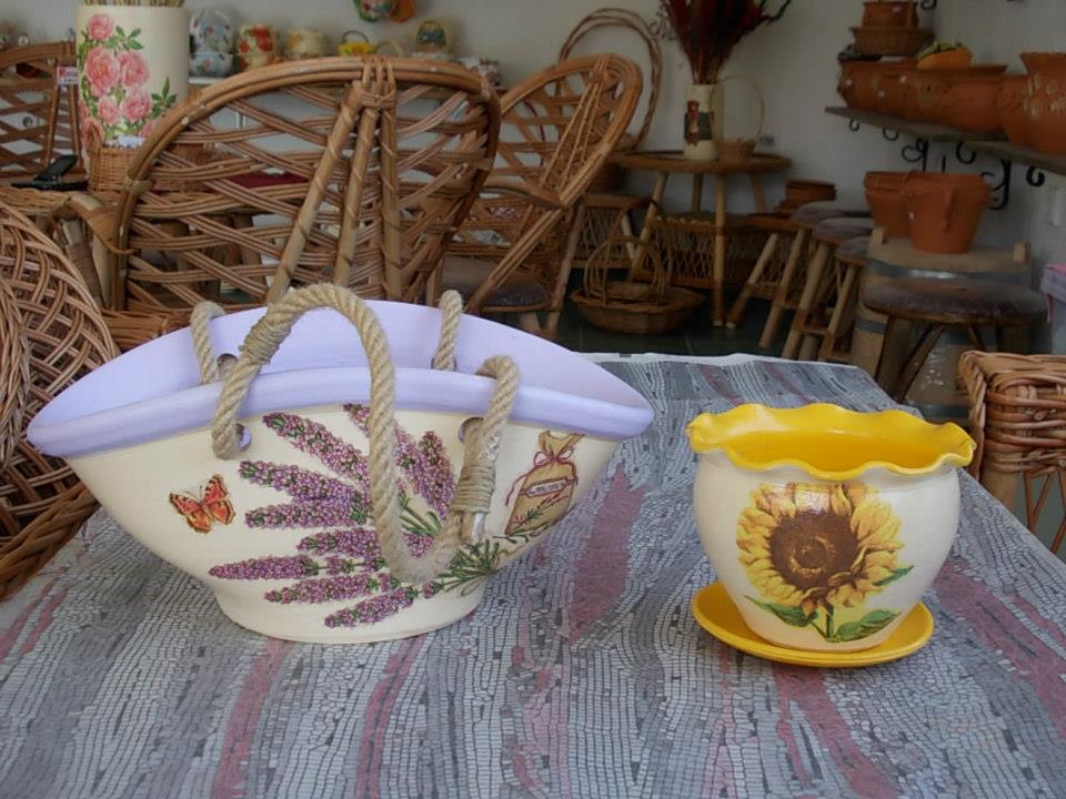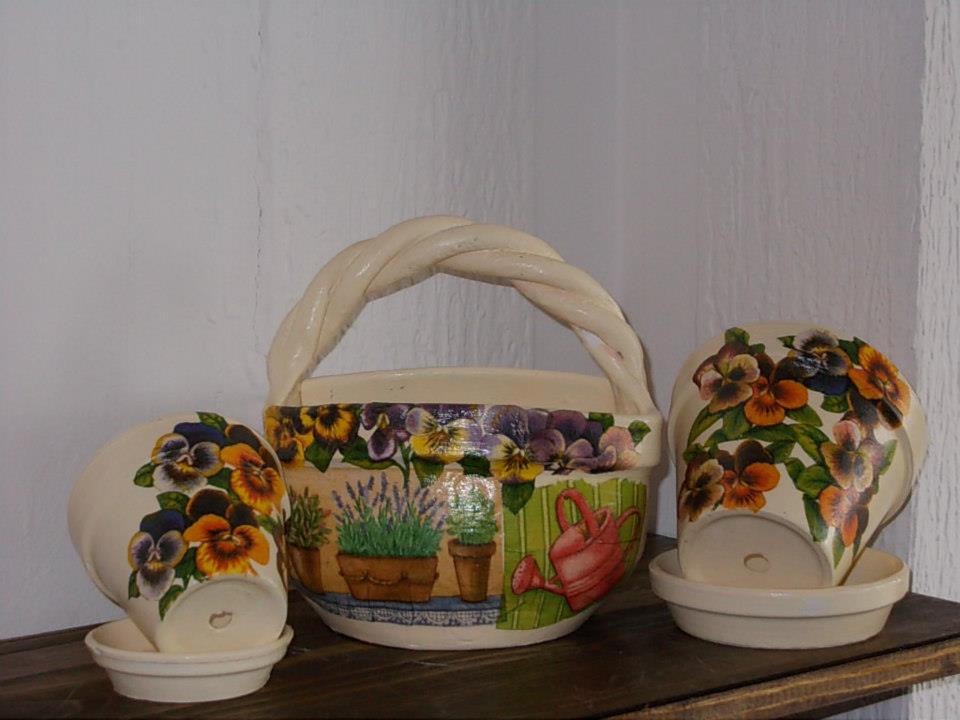 Ukrasna korpa od terakote sa cvetnim motivima i saksije za cvece razlicitih velicina